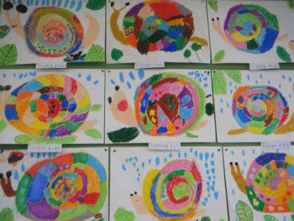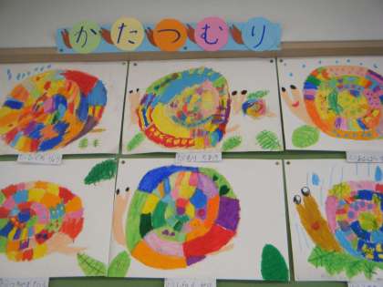 図工で描いたかたつむりが完成しました。どのかたつむりも個性的で素敵に仕上がりました。日曜参観のときにもまだ掲示していますので、楽しみにしていてください。