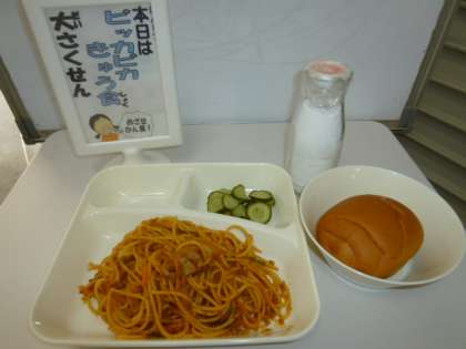 今日の給食はスパゲッティミートソース、きゅうりのピクルス、1/2こくとうパン、牛乳でした。
