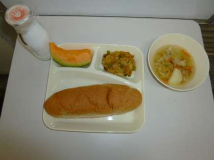 今日の献立はカレードリア、キャベツのスープ、クインシーメロン、ライ麦パン、牛乳です。