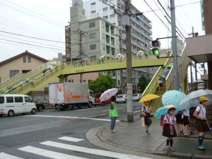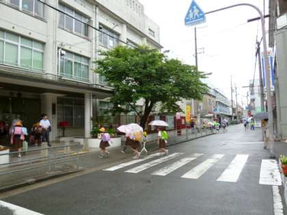 グリーンのベストを着た地域の方が、通学路の辻辻に立って、子どもたちの安全を見守ってくださっています。