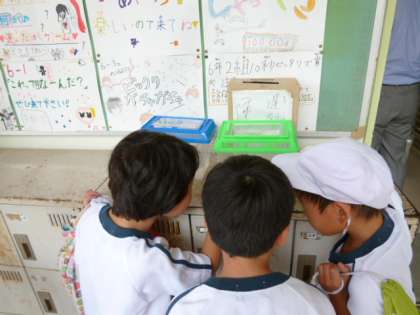 種類ごとに分けて、職員室の前においています。子どもたちは通りすがりに、「ヤゴや!」「大きくなってる!」「羽みたいなのが透けて見えてきた!」と観察しています。