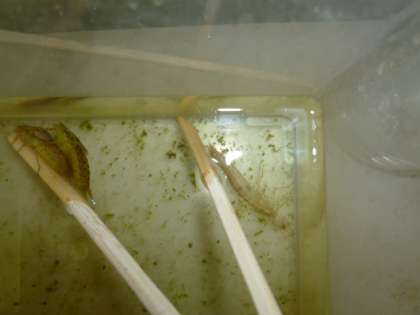 1匹が、割りばしに登って羽化の瞬間を待っています。