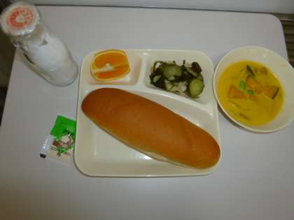 今日の献立はかぼちゃのクリームシチュー、ミックス海そうのサラダ、オレンジ、コッペパン、ソフトマーガリン、牛乳でした。