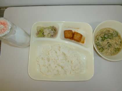 今日の献立は豚肉と野菜のいためもの、かきたま汁、あつあげのみそだれかけ、ごはん、牛乳でした。