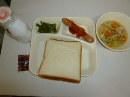 今日の献立はウインナーのケチャップソース、スープ、三度豆のサラダ、食パン、イチゴジャム、牛乳でした。