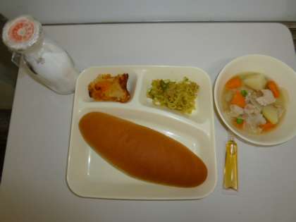 今日の献立は鶏肉と野菜のスープ煮、カレーソテー、ミックスフルーツのクラフティ、コッペパン、はちみつ、牛乳でした。