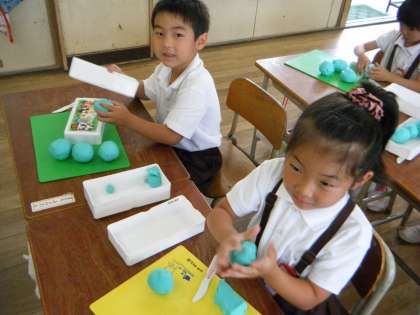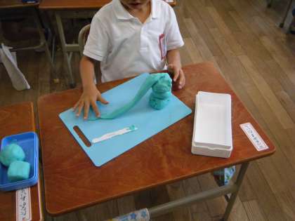 ねんどで色々な形をつくりました。ボール・はこ・ロープなど。作った形を組み合わせていろいろなものができました。ねんどの学習が大好きな1年生です。