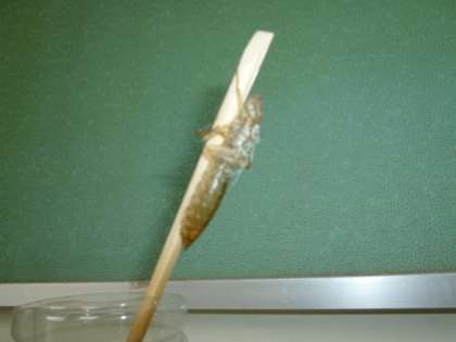 昨日まで水の中で活動していたヤゴが、今朝見ると、割りばしの先で抜け殻になっていました。こんな大雨の朝に羽化して、無事に飛んでいくことができたでしょうか?