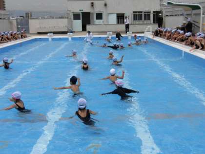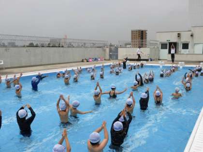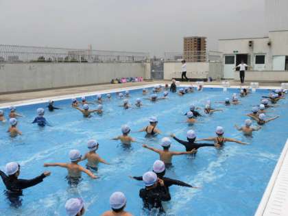 子どもたちはプールの中で、ミッキーマウスの曲に合わせてダンスをしました。