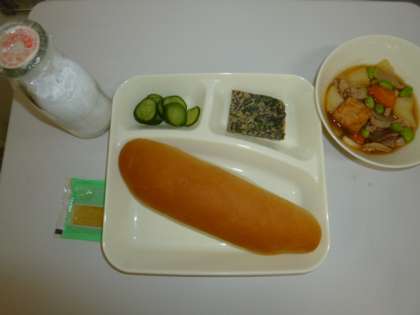 今日の献立はもずく入りヒラヤーチー、豚肉といかの煮もの、あっさりきゅうり、コッペパン、りんごジャム、牛乳でした。