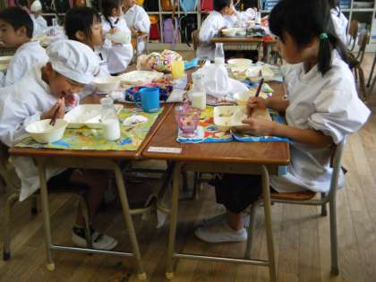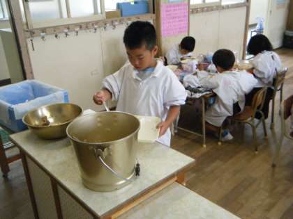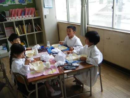 給食にも慣れ、みんなたくさん食べられるようになってきました。給食のときは、同じ班の友だちと楽しくお話しながら食べています。