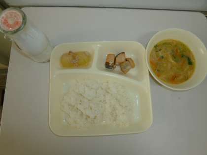 今日の献立は、鮭のさんしょう風味焼き、みそ汁、冬瓜の煮もの、ごはん、牛乳 でした。