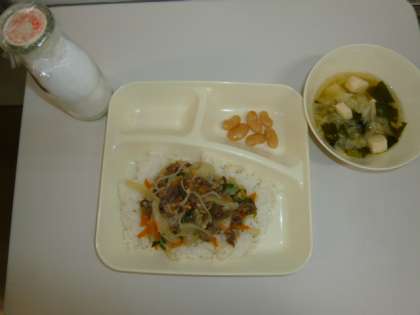 今日の給食は牛丼、すまし汁、大福豆の煮物、牛乳でした。