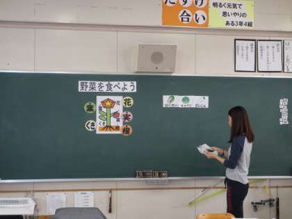 普段、給食に使われている野菜の名前を言ったり野菜の働きを学習したりしました。