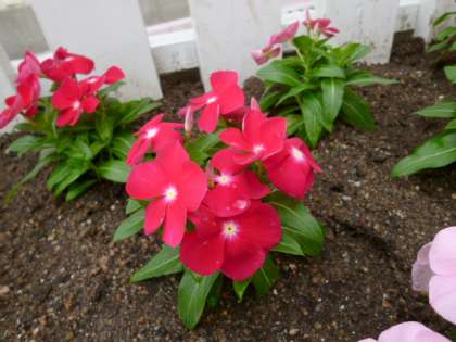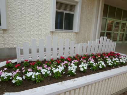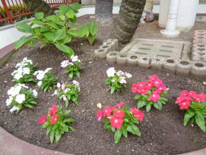 玄関と講堂前の花壇を、ニチニチソウに模様替えしています。