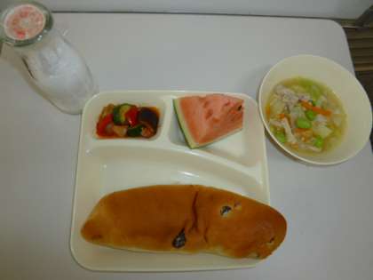 今日の献立は押し麦のスープ、夏野菜とベーコンのソテー、すいか、レーズンパン、牛乳でした。