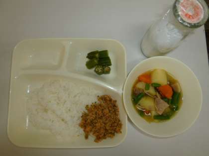 今日の献立は豚肉とじゃがいもの煮物、オクラのかつお梅風味、紅鮭そぼろ、ごはん、牛乳でした。