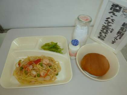 今日の献立は、シーフードトマトスパゲッティ、グリーンアスパラガスのサラダ、発酵乳、黒糖パン、牛乳でした。