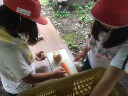 宿舎の方に教わりながら、カレーつくりのスタートです。