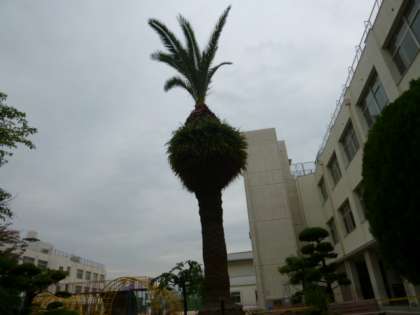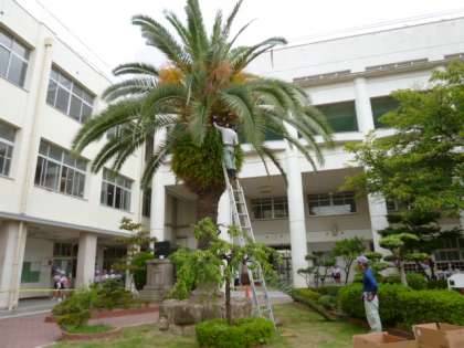 本校に植えられている多くの植栽は、管理作業員さんが日々手入れしてくれていますが、学校では作業できない高木については、一年に一回程度、大阪市の営繕園芸事務所の方に来ていただき、共同で剪定作業を行っています。
