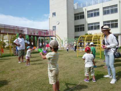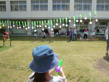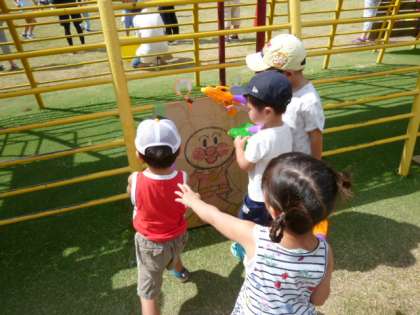 ちびっこたちは、水鉄砲での的あてを楽しんでいます。