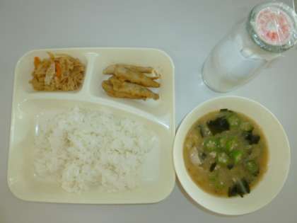 今日の献立は、いわしてんぷら、みそ汁、切り干しだいこん、ごはん、牛乳でした。