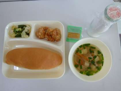 今日の献立は、鶏肉のピリからあげ、中華スープ、キャベツと三度豆のあえもの、コッペパン、りんごジャム、牛乳でした。