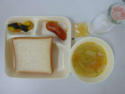 今日の献立は、フランクフルトのケチャップソース、スープ、やきかぼちゃ、食パン、マーマレードジャム、牛乳でした。