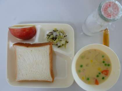 今日の献立はコーンクリームシチュー、キャベツのひじきドレッシング、りんご、食パン、はちみつ、牛乳でした。