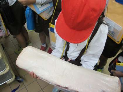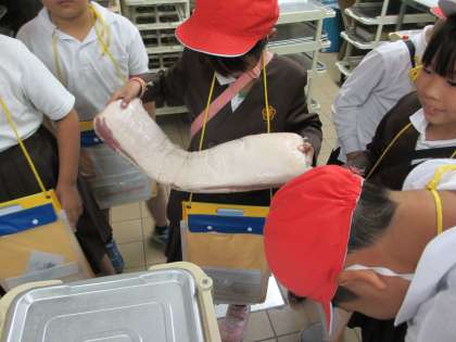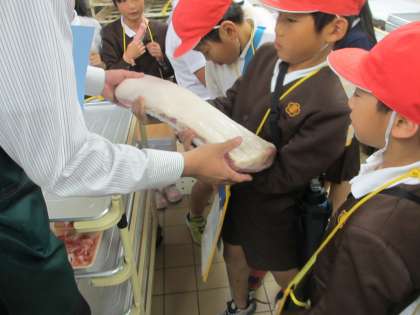精肉の調理場では、実際に売られる前のお肉の塊を見せてもらい、持たせてもらいました。