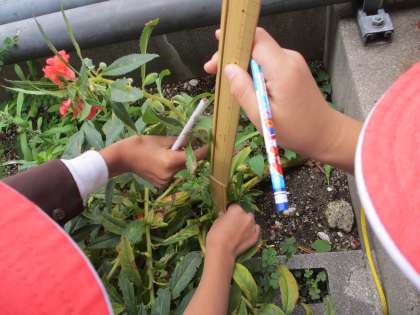 学習園に行って、ホウセンカとマリーゴールドの観察をしました。