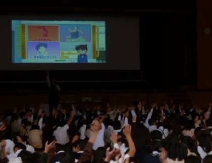 講堂に全員が退避した後は、名探偵コナンの防犯ビデオを見ながら、「こんなときどうする?」という出題に答え、安全を守るための方法について考えました。