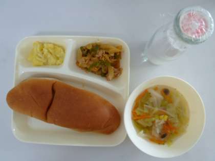 今日の献立は、豚肉と野菜のケチャップソース、スープ、スイートポテト、黒糖パン、牛乳でした。