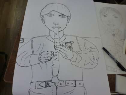 今、4年生では「リコーダーをふいているわたし」を描いています。