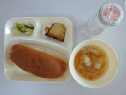 今日の献立は、かつおのガーリックマヨネーズ焼き、スープ、キャベツと三度豆のサラダ、レーズンパン、牛乳でした。
