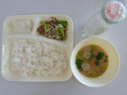今日の献立は、豚肉とまいたけのいためもの、つみれ汁、ういろう、ごはん、牛乳でした。