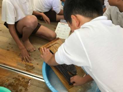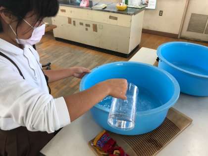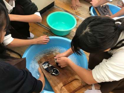 家庭科学習の一環として、洗濯液の作り方から、洗い方・干し方など洗濯の方法を学習し、各クラスで自分自身の靴下を洗濯する実習を行いました。