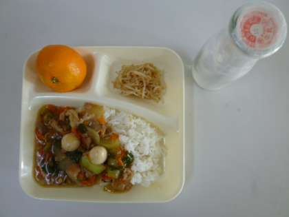 今日の献立は、中華丼、もやしの中華あえ、みかん、牛乳でした。