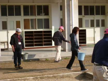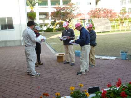 業者さんと入念に打ち合わせをして、まずは狭くて蒔きづらいところを、大人だけで作業していただきました。