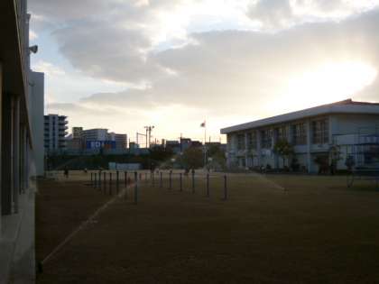 薄暮の校庭に、スプリンクラーの水音が静かに響きます。