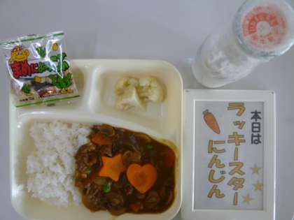 今日の献立は、ビーフカレーライス、カリフラワーのサラダ、まめこんぶ、牛乳でした。