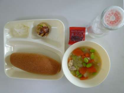 今日の献立は、たこボール、洋風煮、大根のピクルス、ライ麦パン、いちごジャム、牛乳でした。