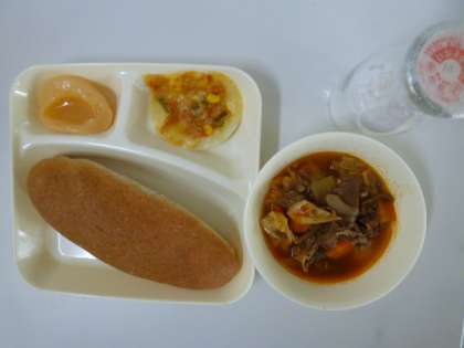 今日の献立は、牛肉のケチャップ煮、変わりピザ、白桃(缶)、ライ麦パン、牛乳でした。