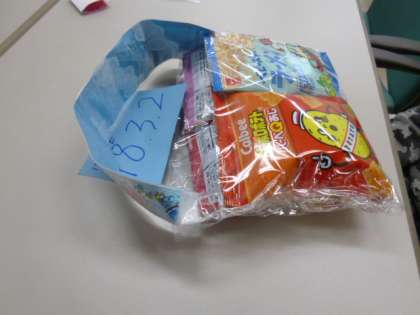 ちなみにバッグの持ち手部分も、お菓子でできています。青いカードに書いてある「18.3.2」の数字は、2018年3月2日が賞味期限だということを示しており、完成したバッグに同封して備蓄します。