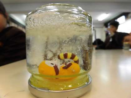 今日の科学クラブでは、スノードームをつくりました。最初はビンのふたの裏にスポンジを取り付けるところからはじめました。そして自分たちの家から持ってきたラメやビーズなどをびんの中に入れてスポンジにフィギュアをのせて洗濯のりと水を入れて完成です。
