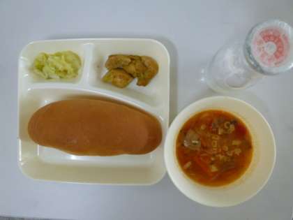 今日の献立は、鶏肉のカレー風味焼き、ミネストローネ、サワーキャベツ、コッペパン、牛乳でした。