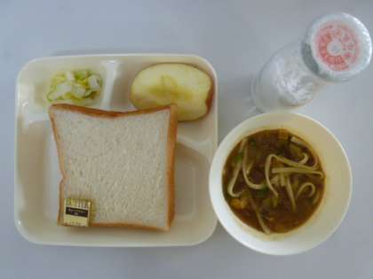 今日の献立は、カレーうどん、白菜の甘酢和え、りんご、食パン、バター、牛乳でした。