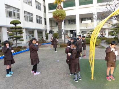 そして、2学期最後の科学クラブの実験はシャボン玉をしました。準備物は洗濯用洗剤、シャボン玉のまくを固めるのに砂糖を使います。あとは、ぬるめのお湯でかき混ぜたらシャボン玉えきの完成です。できたシャボン玉のえきをストローで吹いてみるときれいなシャボン玉を作ることができ、楽しく活動できました。