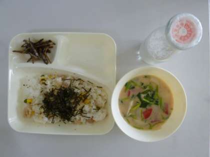 今日の献立は、れんこんのちらしずし、雑煮、ごまめ、牛乳でした。