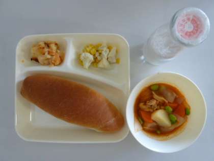 今日の献立は、鶏肉と野菜のケチャップ煮、カリフラワーとコーンのサラダ、桃のクラフティ、コッペパン、牛乳でした。